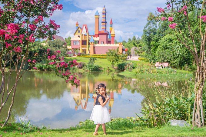 往里走有一座童话城堡,拍照很出片。当天去天气很好,配上蓝天白云也太美了吧。