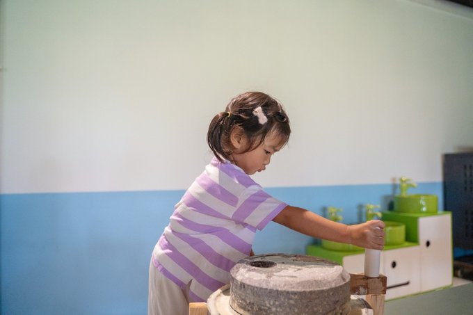 餐厅还能带孩子体验一下磨豆浆的乐趣,孩子第一次见到这种磨子感觉很新奇。