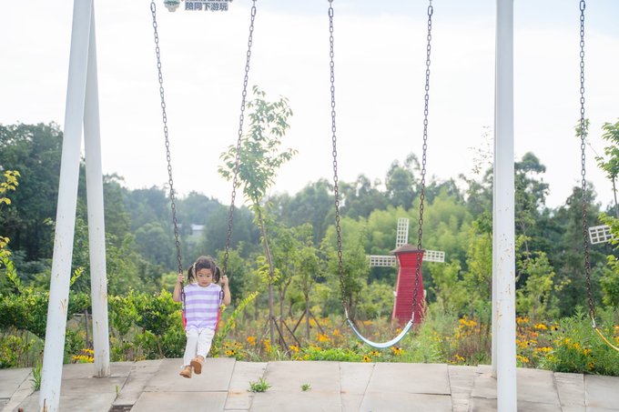 山顶还有个花海秋千,开满鲜花场景很梦幻。