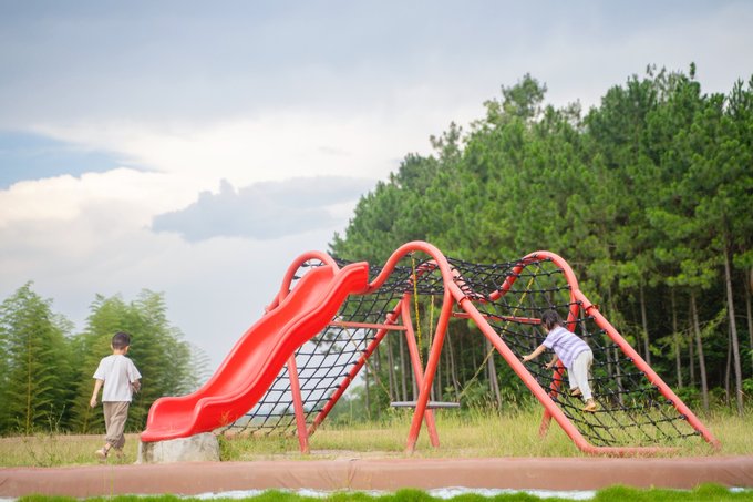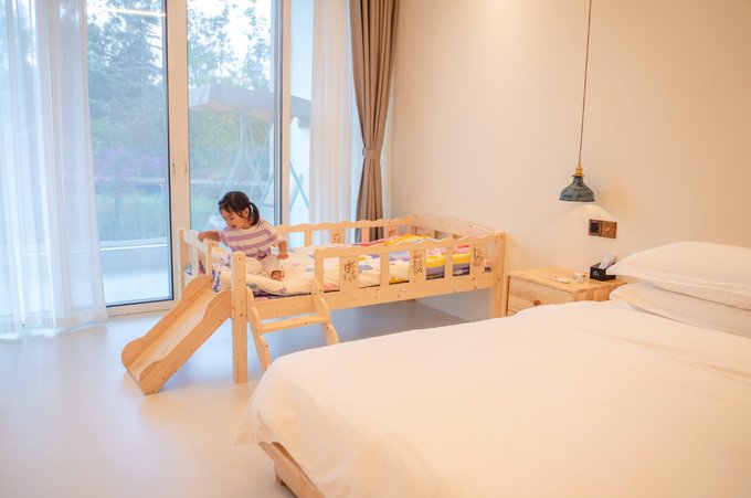 酒店配套了很多亲子游玩设施,室内游乐室、VR室。室外有彩虹滑道、丛林探险、网红秋千等。