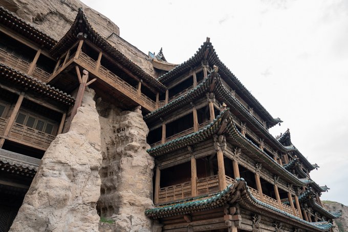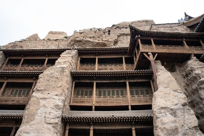 为了保护这些艺术巨作,在石窟之间,建起一些阁楼,镶嵌进石壁,融为一体。