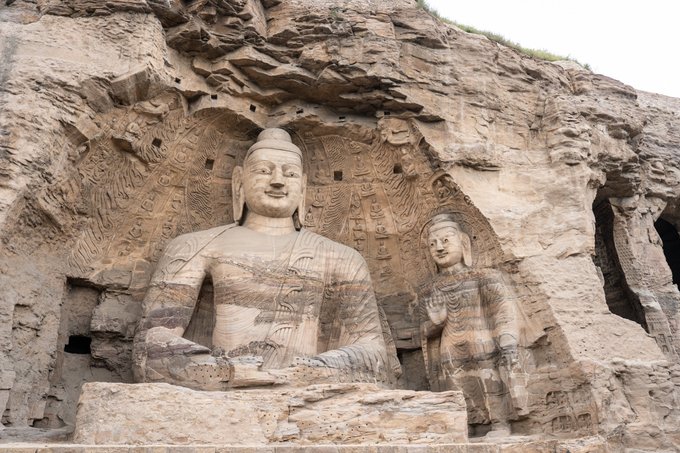 最有名的昙曜五窟,但是由昙曜主持修建的。所以在园区的入口处,便有昙曜的雕像。 五个石窟的中央都雕刻着巨大的如来佛像,象征了北魏五朝的五代皇帝,昙曜五窟(是云冈开凿最早,气魄最宏大的窟群。五窟六窟毗连成一组双窟,规模宏伟,技法熟练,为云冈艺术之精华。