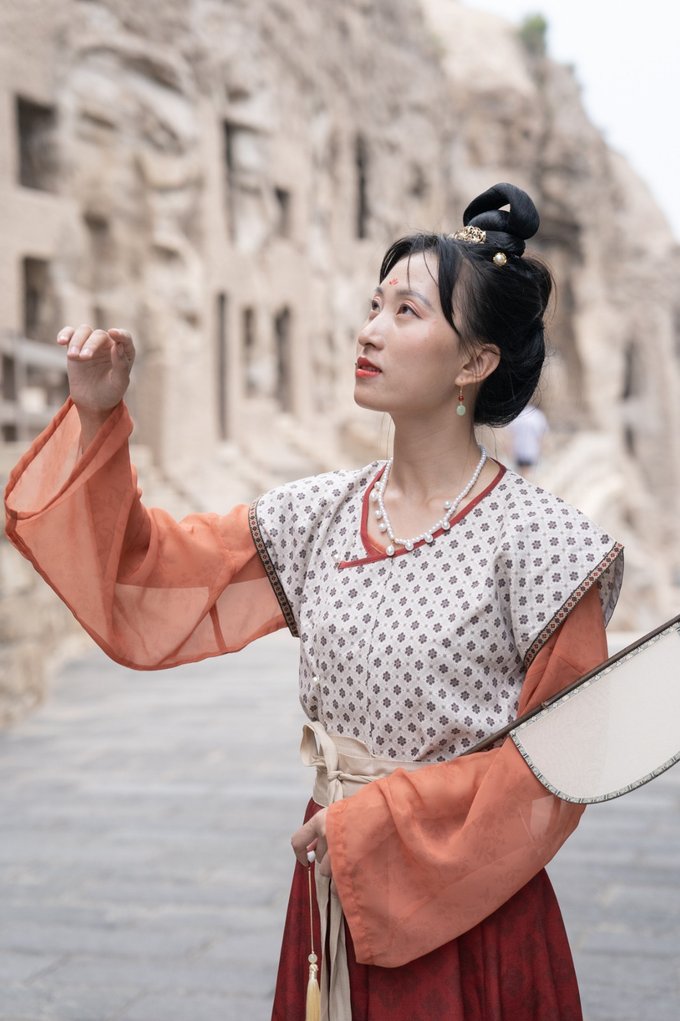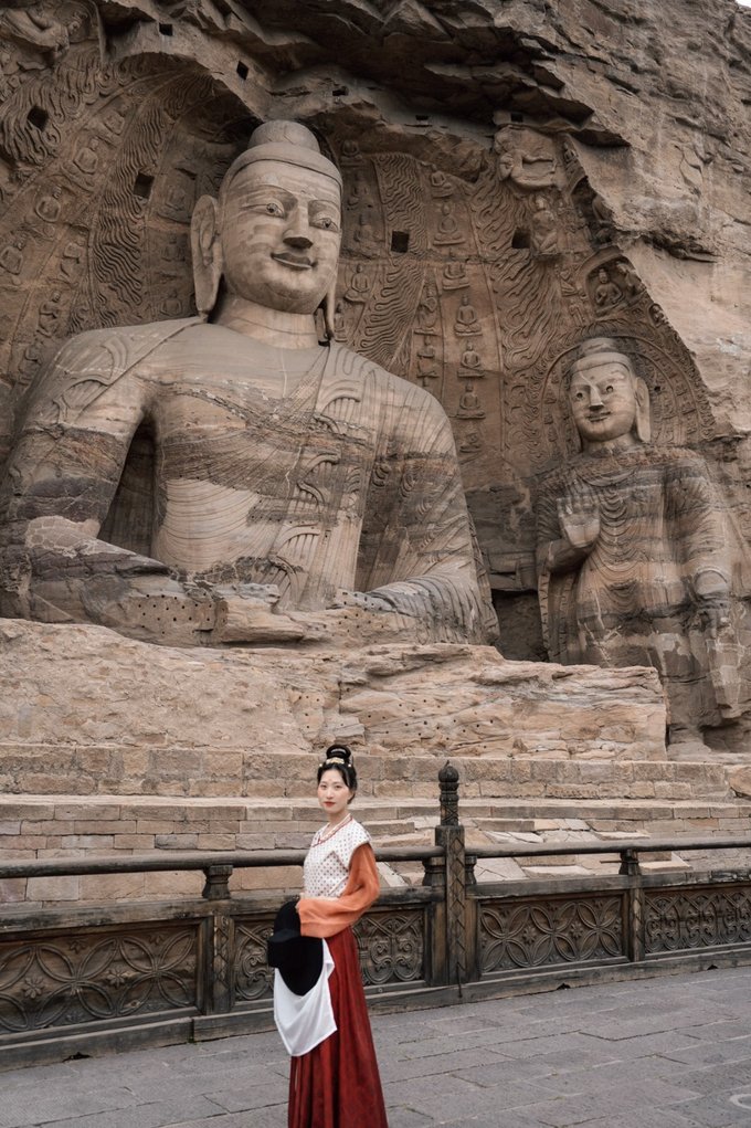 汉服的气质和云冈石窟是很搭的,怎么拍都感觉可以融入环境,一点都不违和。唐朝的服饰很是合适,不管是襦裙还是褙子,不过一定得搭上帷帽,感觉一下就上来了。昙曜五窟高大的神佛使得照片更有视觉冲击力,让你的照片瞬间在朋友圈出圈。