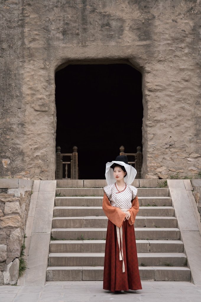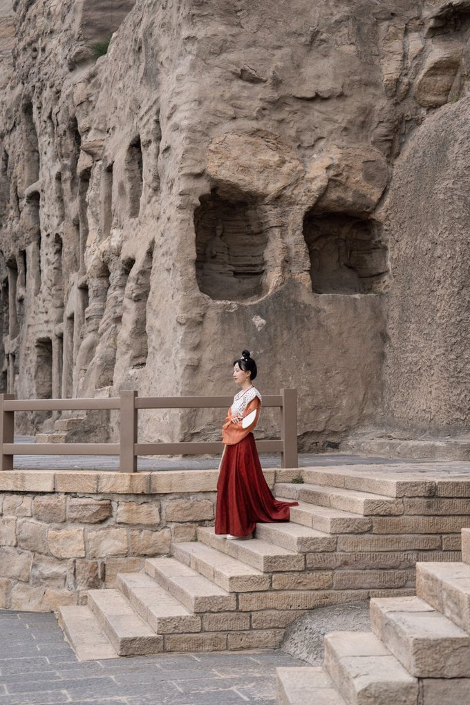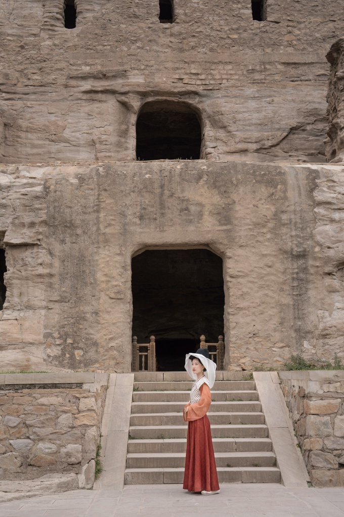 我们从晋北开始说起,鼎鼎有名的 大同 ---云冈石窟,便是特别适合拍摄汉服的地方,裸露的石雕佛像,深沉的颜色,颇有踏入大漠孤烟的氛围,尤其适合拍唐朝褙子,再搭配上帷帽,长途跋涉的感觉瞬间就出来了。出了雁门关,便是征战不休,便是荒芜的破碎感。