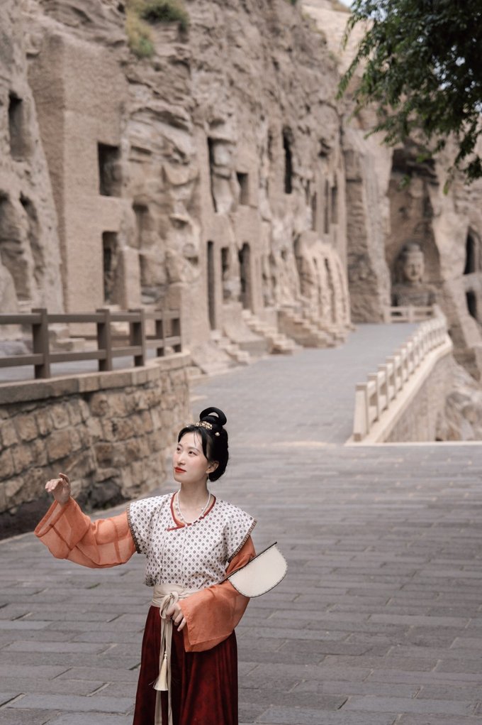 在云冈石窟,除了这些石窟,还有很多宫殿式的建筑,穿上汉服拍照非常地合适。