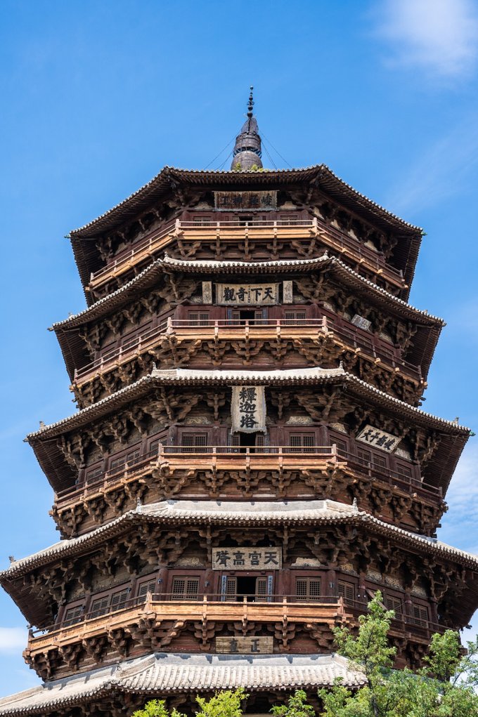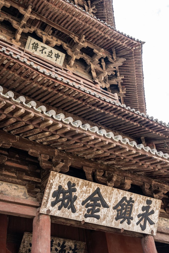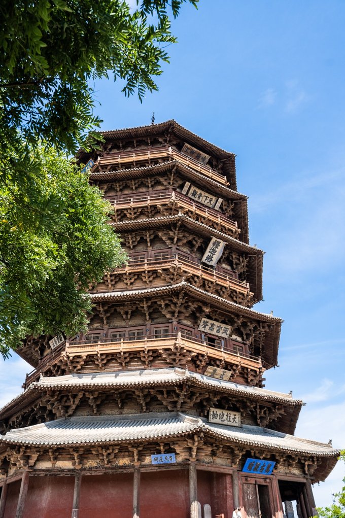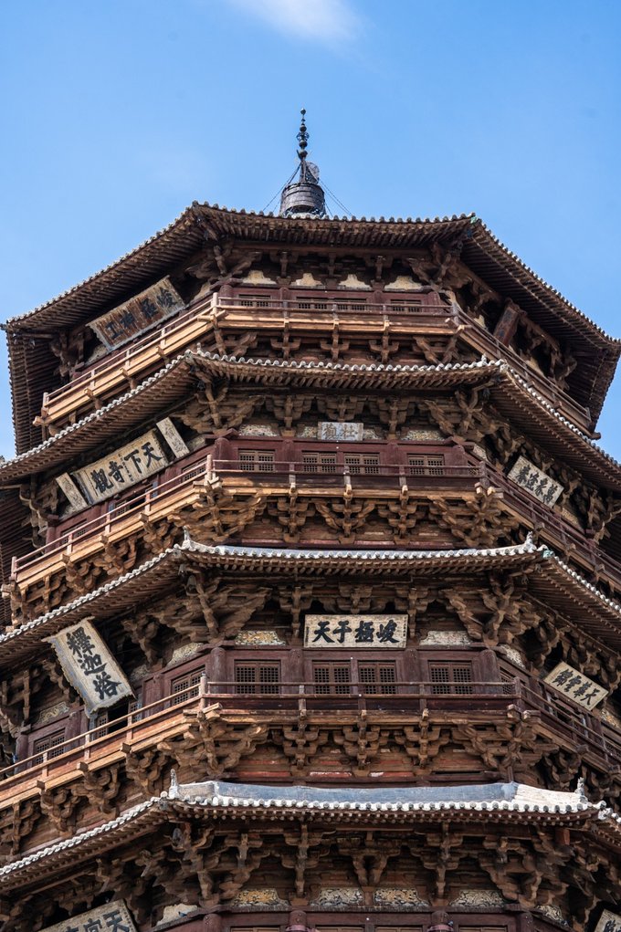 塔高67.31米,相当于20层楼的应县木塔,全木结构,没用一根钉子,仅靠一榫一卯,就让32根木柱子撑起了2600吨的重量。主要承重的柱子只有24根,却抵挡了400多次地震和200多次炮击。饱经风霜,从辽代屹立至今有千年,近距离观看,感受到了无比的震撼。