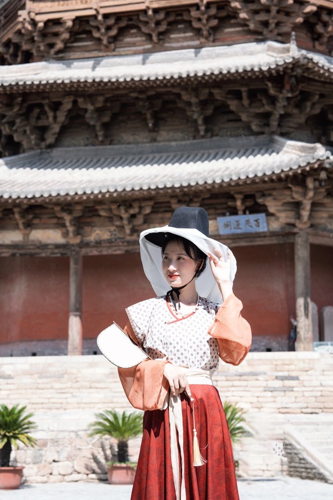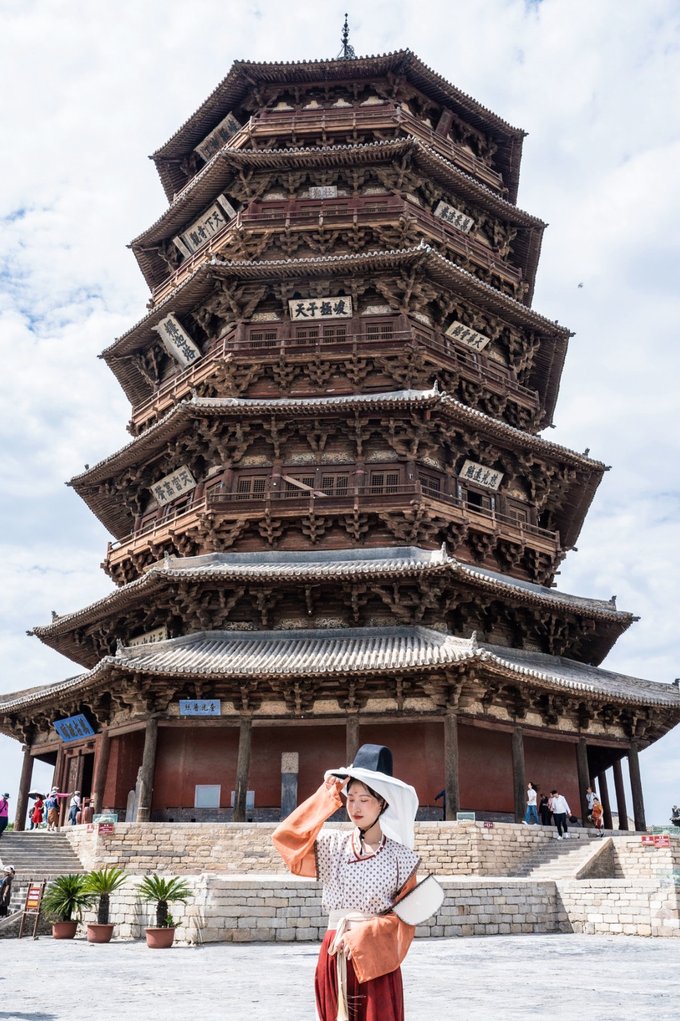 朔州·应县木塔 应县 木塔全称:佛宫寺释迦塔。建于辽道宗清宁二年(1056年),距今已有959年历史。塔高67.31米,是我国现存最古老最高大的纯木结构楼阁式建筑,是 中国 古建筑中的瑰宝,世界木构建筑的典范。属华夏第一,举世无双。 在这样古老的木塔下 ,也适合拍上一套汉服,我还是选择唐褙子加上帏帽,怎么拍都能融入环境。 朔州 的 应县 木塔也是可以穿上汉服在这里拍照的。