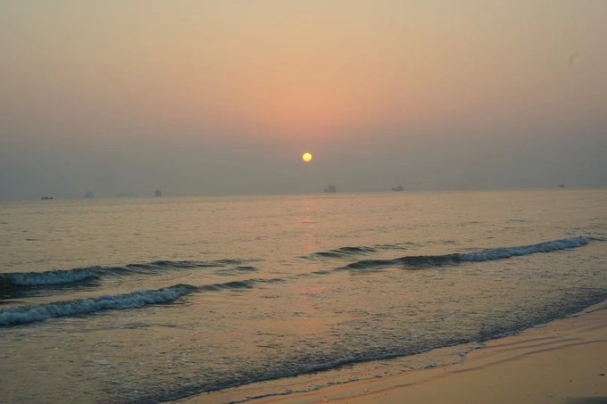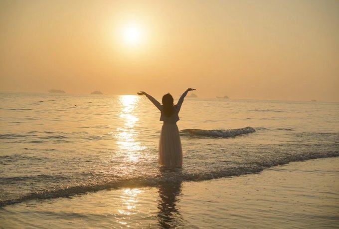 但银滩最美的还是傍晚日落时分,见过好几次金黄色、朦朦胧胧的银滩日落,天空和海水染上粉金色,像揉碎的金子。