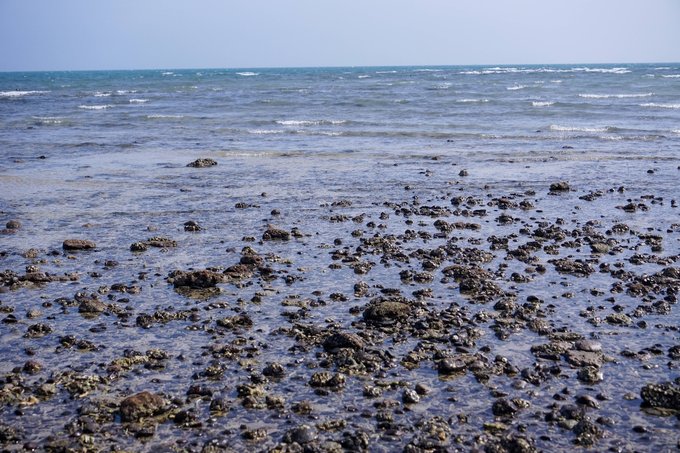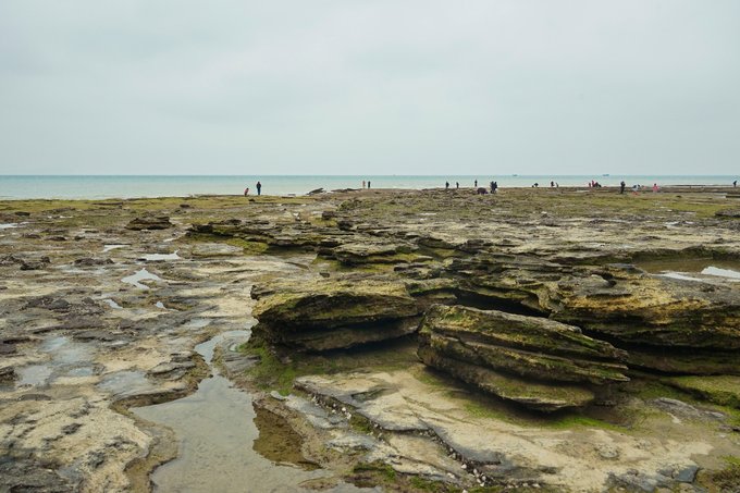 出了村口,马路对面就是贝壳沙滩,沙滩上聚集了大量的贝壳,有的凝固在一起,有的深深嵌入礁石上,人们踩着海水弯着腰,在这里享受捡贝壳的浪漫与童趣。