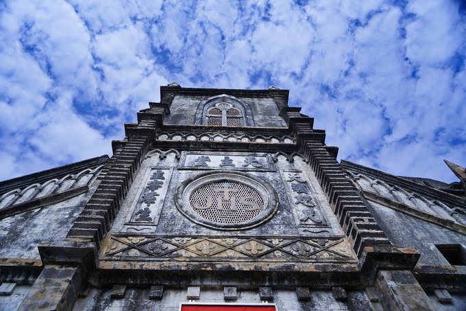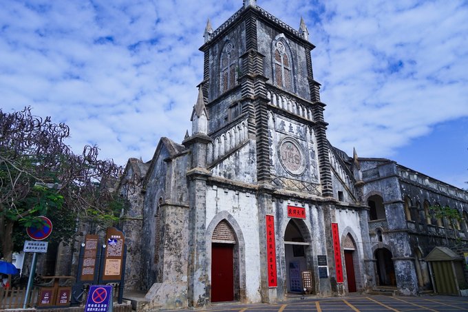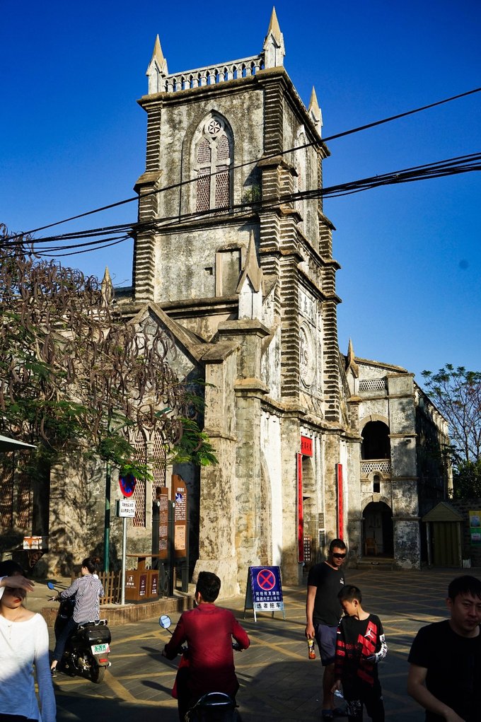这座教堂有170年的历史,法国人建造,墙面采用涠洲岛特有的珊瑚石砌成,一眼看去粗粝冷峻,坚固无比。