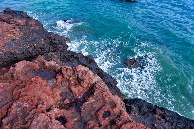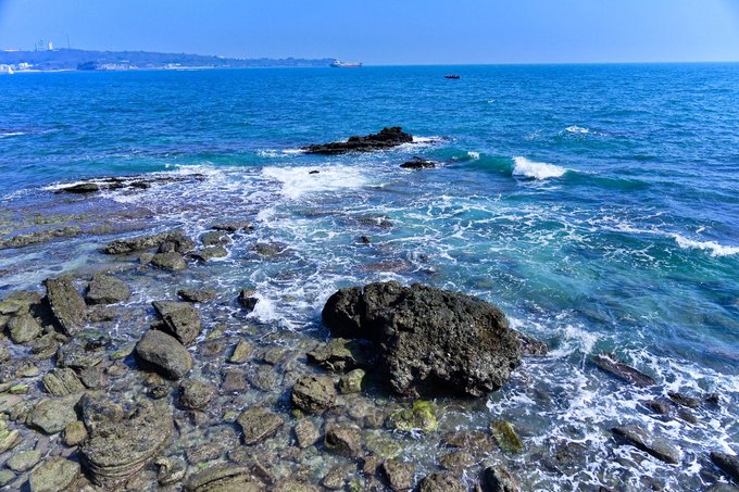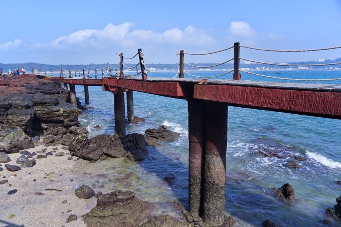 沿着海边栈道走去,千万年前火山喷发形成的火山石就散落在路边,在海水的侵蚀下,幻化成千奇百怪的形状。