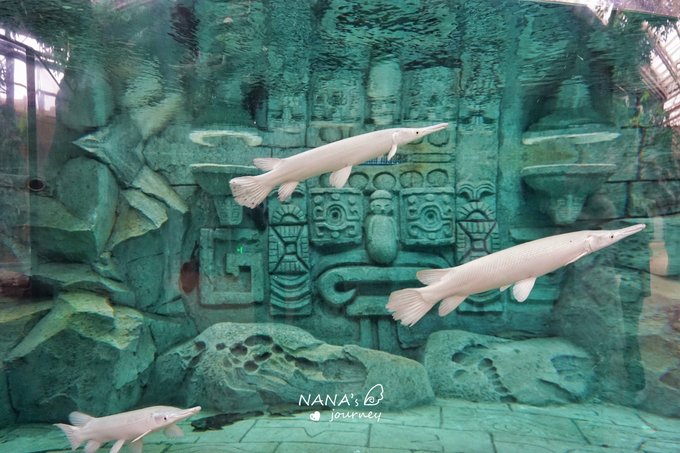 玛雅风的图腾做成了鱼缸的背景,而水里游的都是神奇的鱼类,虽然叫不上名字,但也能感受到雨林生物的神秘气息。