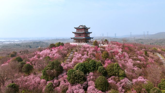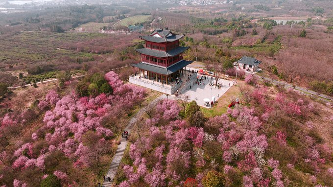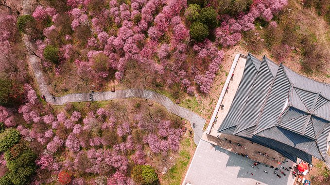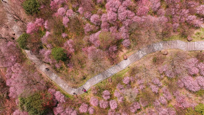 进入农业科技园大门口有一条梅花大道,这里就可以赏梅,但是如果想避开人流,可以继续往前走,在一个山凹村的岔路口往左边山上的方向走,上山的一路都是梅花,山顶有一个赏梅阁,可以登顶,无人机视角俯瞰梅花山。