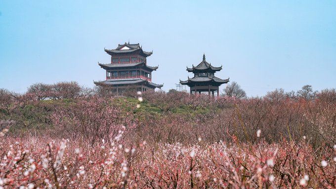 整个园区很大,有成片梅林梅山,放眼望去,粉嫩嫩的一片,应和着春日的蓝天白云,超美!