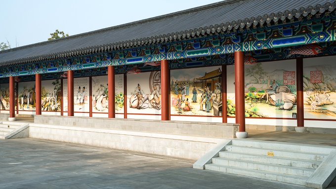 跨过迎恩阁就来到了古戏台和廊道,廊道内有24面壁画,主要表现溧水历史文化的内容,置身其中,仿佛身临其境一般,而丹青绘事,色彩之间的碰撞也绝对是一场视觉盛宴。