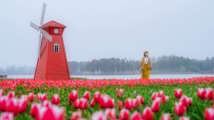 大片的郁金花花海,还有风车、教堂、秋千、稻草人等拍照打卡装置,怎么拍都好看。