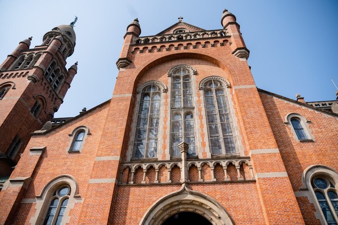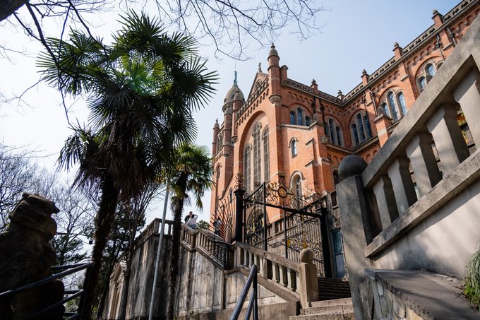 这里是中国近代天文学史的发源地,标识性的白色圆顶掩映在竹海林间。光绪二十六年(1900年),余山天文台正式落成。圆形拱顶及0.4米天文望远镜均购于法国。 法式小洋楼的建筑风格,仿佛穿越到一百年前。天文台内设了多个展厅,展览世界以及我国天文学的发展历史。子午仪,最美天星图,即使是冷冰冰的科学知识,置于这个空间也多了几分浪漫。饭饭一直问我通过这个大望远镜,可以看到什么? 由于当时创立天文台的工作人员大多是传教士,所以红砖结构的天主教堂就建在天文台旁边。 百年后的今天,依旧保持着这样的格局。这也是当时的“远东第一大殿”。也是是余山的标志。整座建筑造型独特,南长北短,东宽西窄,内圆外尖,内石外砖。外观很宏伟,很多人对着教堂打卡,现在还可以参观教堂内部。