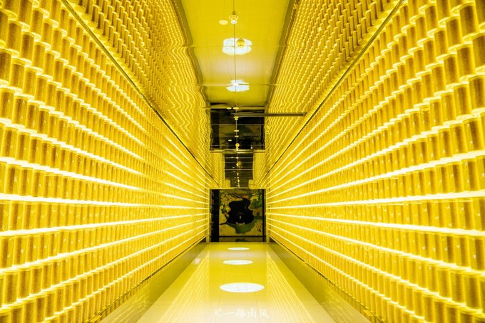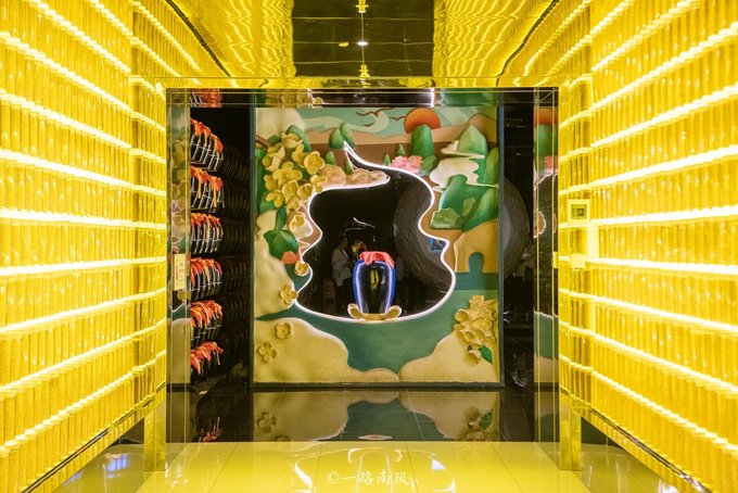 往前参观,一条“金光大道”赫然出现在眼前,据说此处由2888瓶桂花干组成,是个非常有创意又很适合拍照的打卡点。