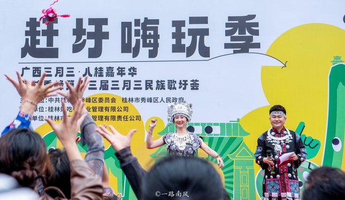 游桂林,必游两江四湖,靠近解放桥的滨江路秀峰段是欣赏漓江两岸风光的好地方。这里绿树成荫,不远处就是著名的象鼻山。2024桂林秀峰第十三届“三月三”民族歌圩荟暨“秀峰三月三·赶圩嗨玩季”在此举行。