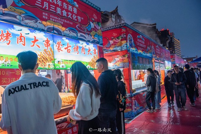 适逢三月三假期,加上桂林秀峰第十三届“三月三”民族歌圩荟暨秀峰三月三·赶圩嗨玩季举办期间,东西巷商圈作为分会场,比以往更加热闹。这里的主题是“赶圩嗨玩季·好味东西巷”,现场南北美食大斗法,游客逛得开心,吃得开心。