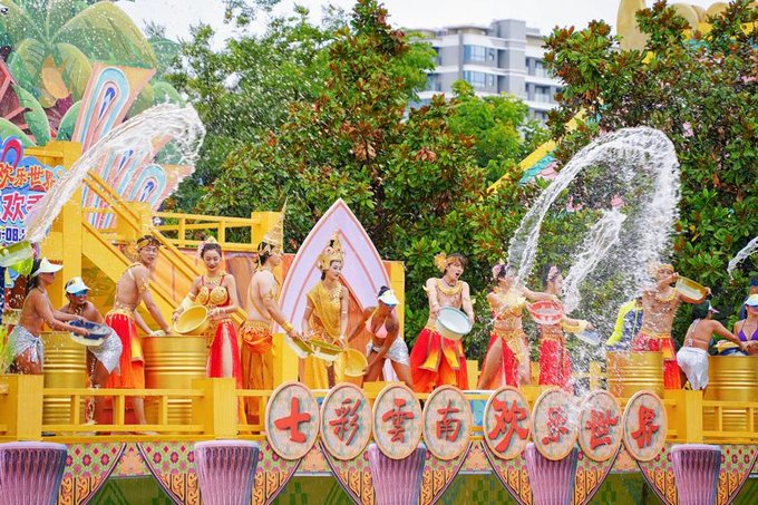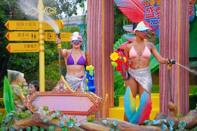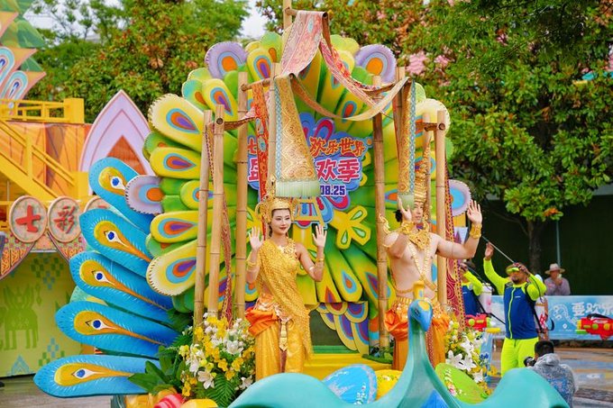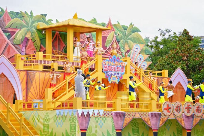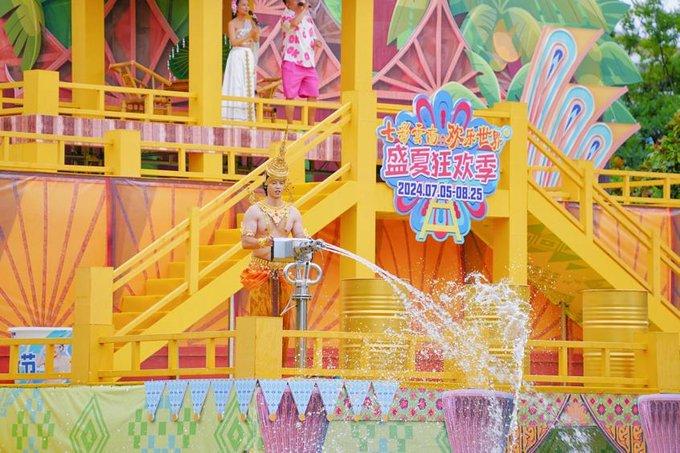 盛夏狂欢季,演艺节目丰富多彩。泼水狂欢大巡游是由傣族元素、癫狂元素两个方阵组成,在进行游园活动的同时,伴随着歌舞表演和泼水,现场非常热闹,最刺激的还是水舞台的泼水狂欢了,在傣族象脚鼓与哥伦比亚水鼓的表演结束后,现场游客拿着泼水道具蹦傣迪,蹦迪结束后进行分队泼水的游戏,清凉一夏,太好玩了。 🎈时间:2024年7月5日——8月25日。