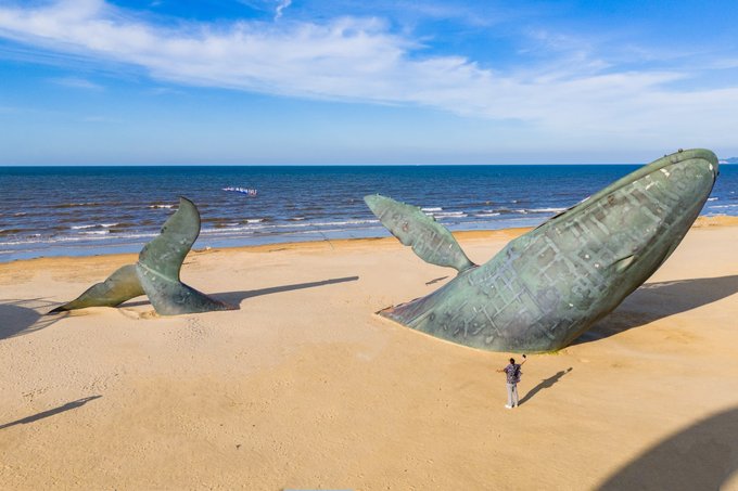 下午我们来到的是天马栈桥、孤独的鲸以及金沙滩。孤独的鲸是烟台十分网红的景点,如果想拍全,最后是要有一台无人机。想要拍到没人的“鲸鱼”,可能要一早来才行。当然我们下午来的,游客还是非常多的,不过因为背景和沙滩都很干净,也方便照片后期处理。我拍的下图其实是张“大合影”,但用手机修图软件就能很快把路人都给抹掉。