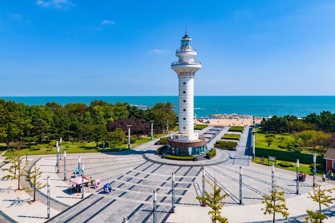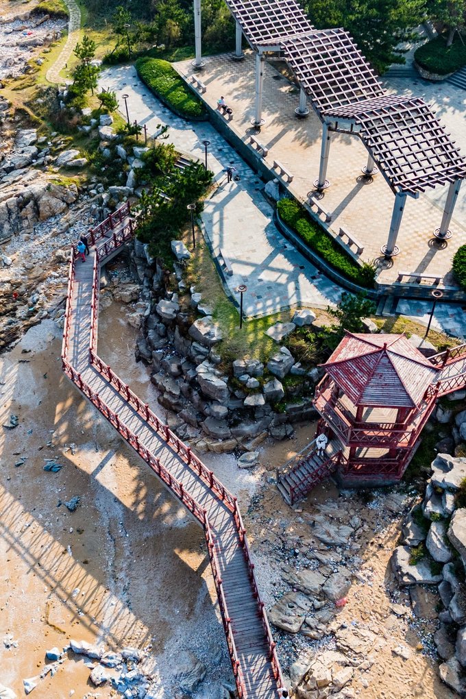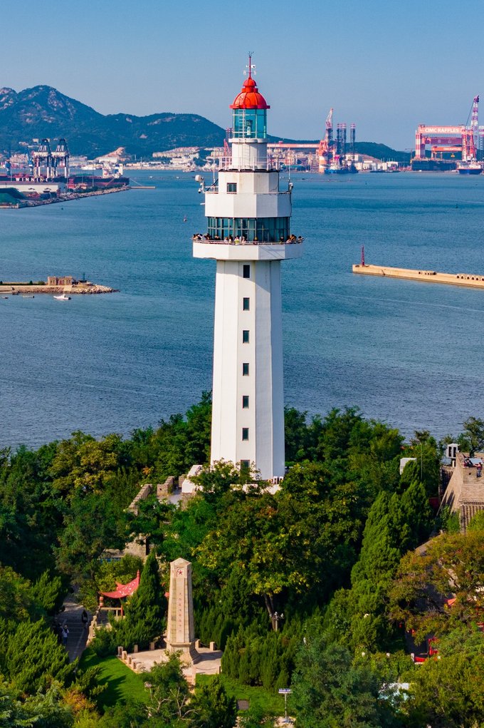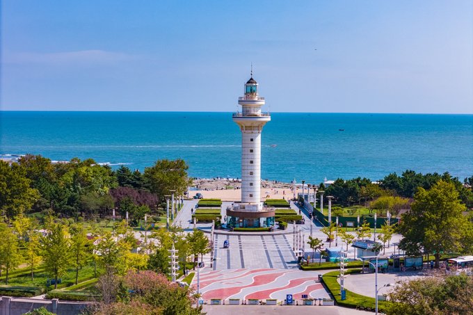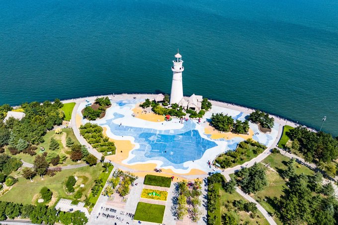 📍悦海公园,公园内有一座大灯塔,属于当地的地标建筑之一,如果航拍看起来,周边还有红色屋顶的房子,再搭配上绿树和行车,给人很小清新的感觉,格外好看。