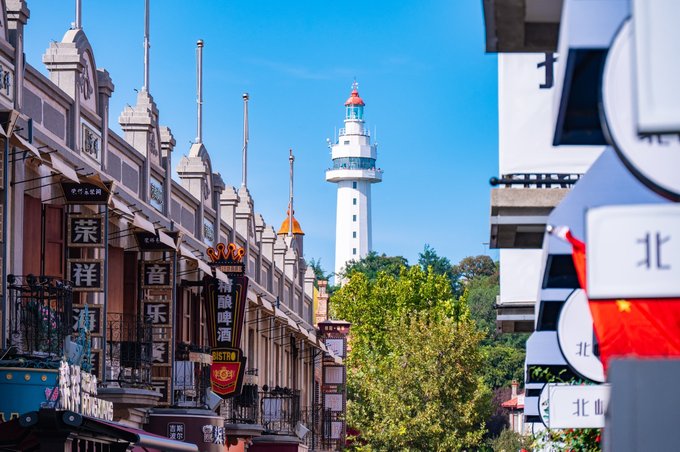 海滨中路可以拍到背景像城堡一样的“海上布拉格”;虹口1920微度假历史文化街区的海岛日记店门口有许多的草莓熊;所城里大街是老城区,“烟台”墙很好拍;朝阳街连着烟台山,有很多的历史建筑,山上的灯塔更是烟台地标。