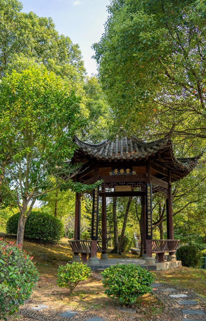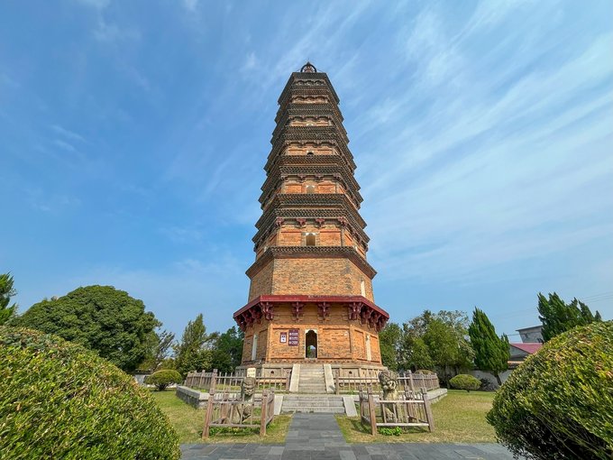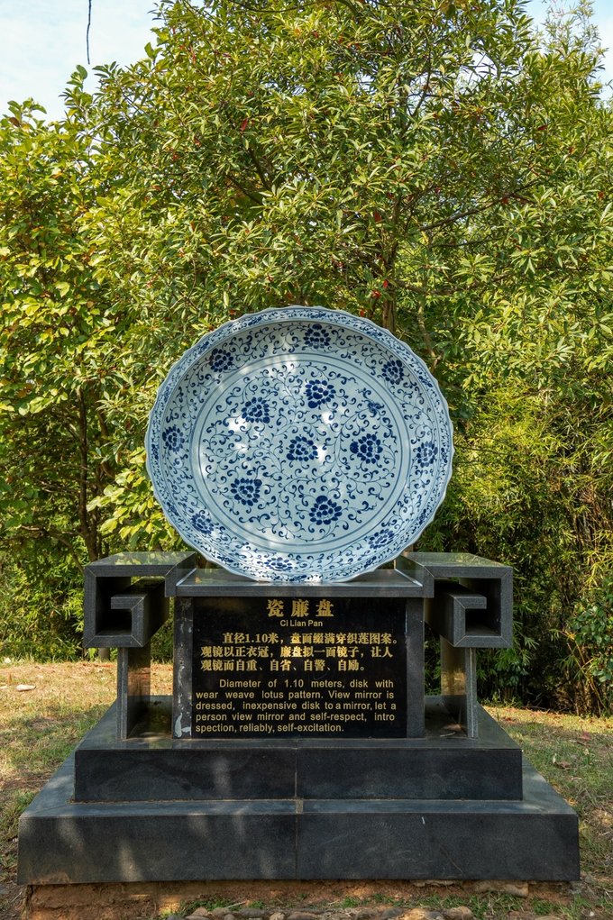 浮梁古县衙的花园有一些陶瓷小景,适合拍照。县衙旁边的红塔有“江南第一塔”之称,历史可以追溯到唐代,已有1000多年。这是一座平面六角形七层砖塔,融合了江南建筑特色,雄伟、庄严,和浮梁古县衙交相辉映,增添了县衙的气势。