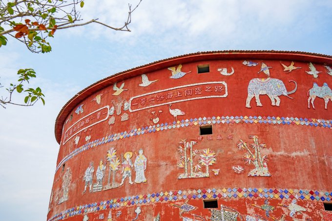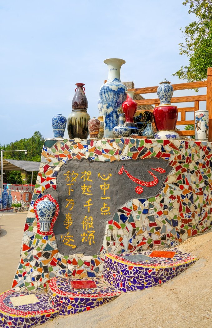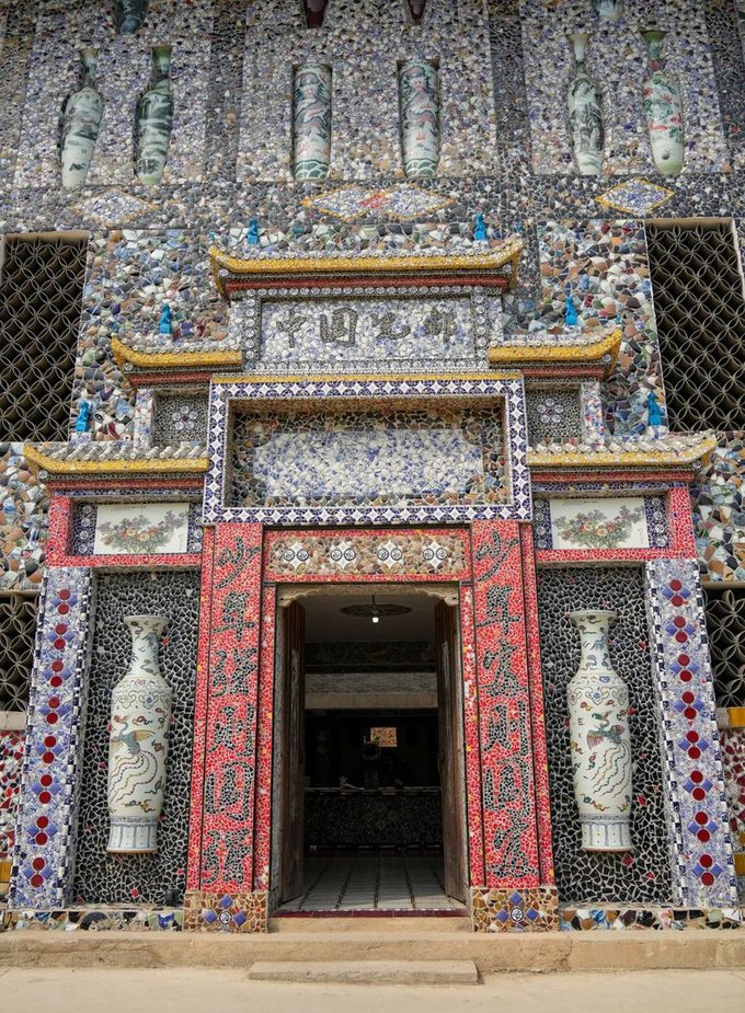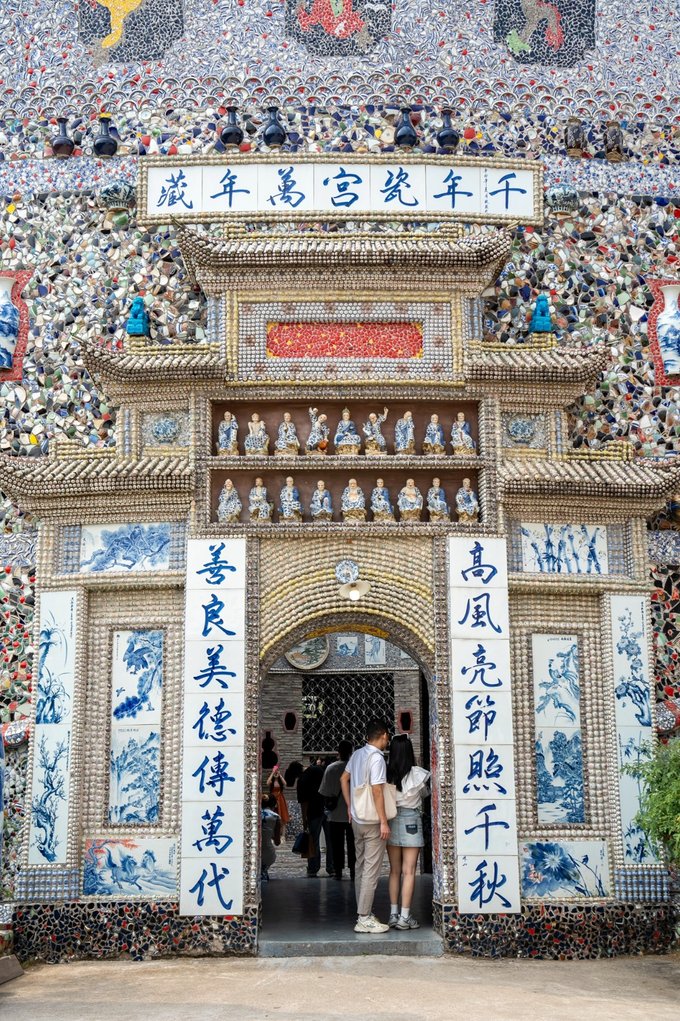 瓷宫的外观风格源于客家围屋,既有方形结构,也有圆形构造,每栋房屋都镶嵌了数以万计的瓷片、瓷瓶、瓷盘等陶瓷艺术品,看似随意混搭,实则每个细节都经过精心考量,含有美好的寓意。