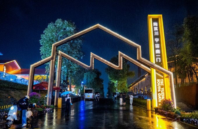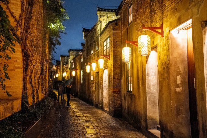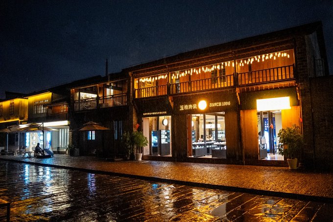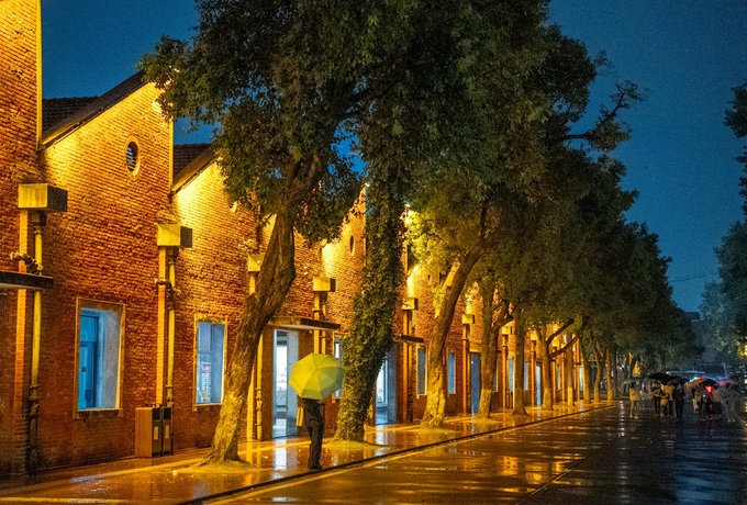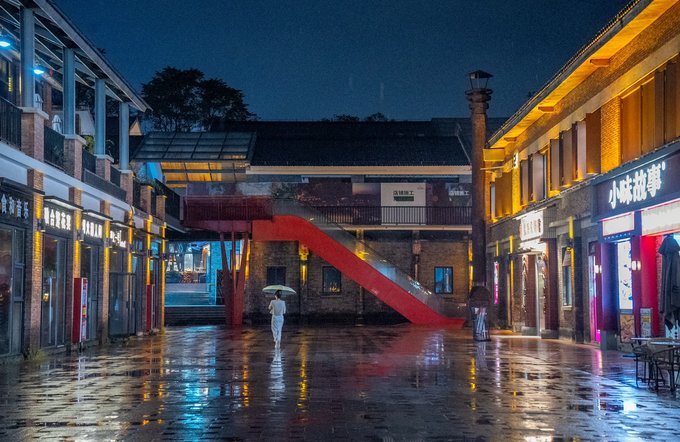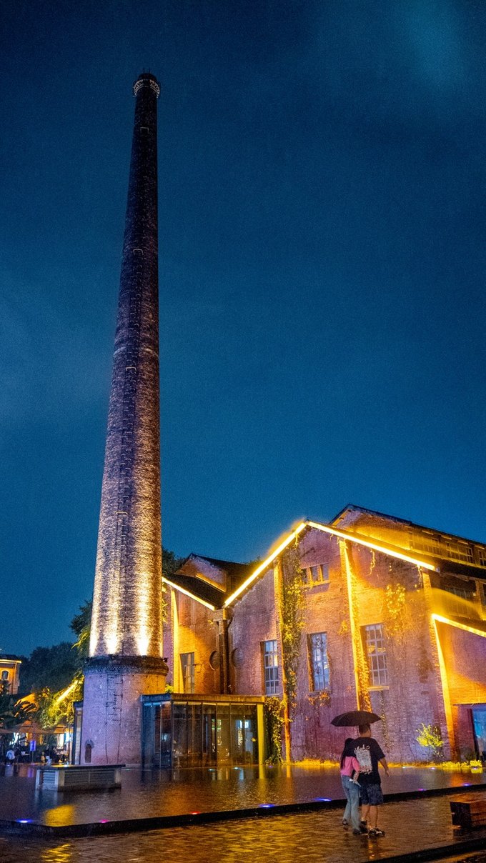这里是怀旧的,又是现代的,充满创意的街区风情和老厂房碰撞出独特的时代火花。 黄昏时分来到陶溪川,小雨淅淅沥沥,雨中游人不多。入夜后,雨水悄然告别,街区变得瑰丽、浪漫,有种奇妙的静逸之美,游客也逐渐多了起来。