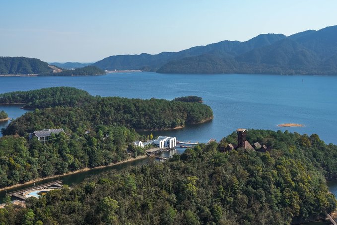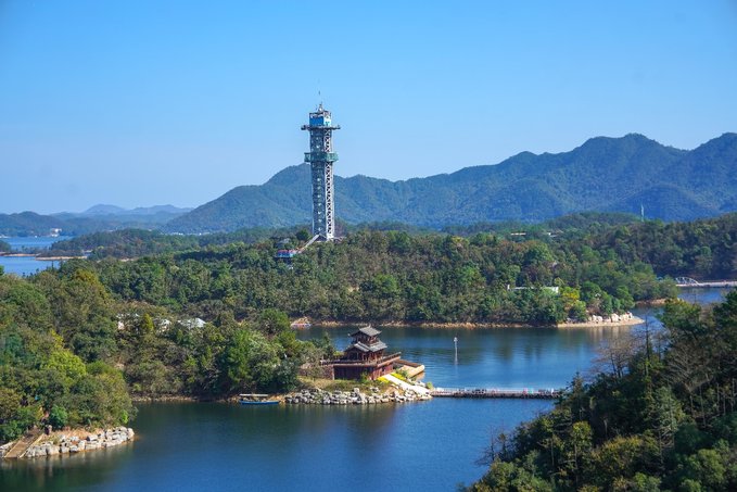 云居岛:千岛湖中间突然出现的岛屿,上面有沙滩和椰林,登上阁楼远眺,整个岛屿的风光尽收眼底。