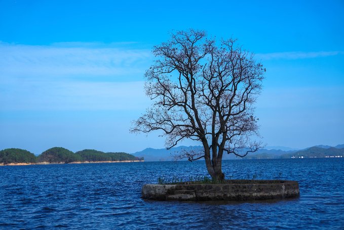 沧海一树: 在诺大的湖面上,突然出现了一棵孤独的树,湖面中央的孤独树,是众鸟的栖息地,其实它是一座山顶。 它历经风雨沧桑,依然枝叶繁茂,在夏天的时候,整棵树上都是绿叶。
