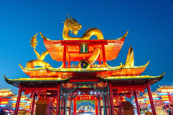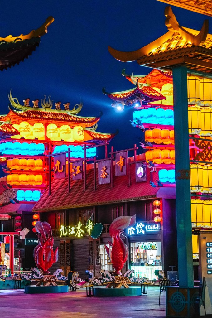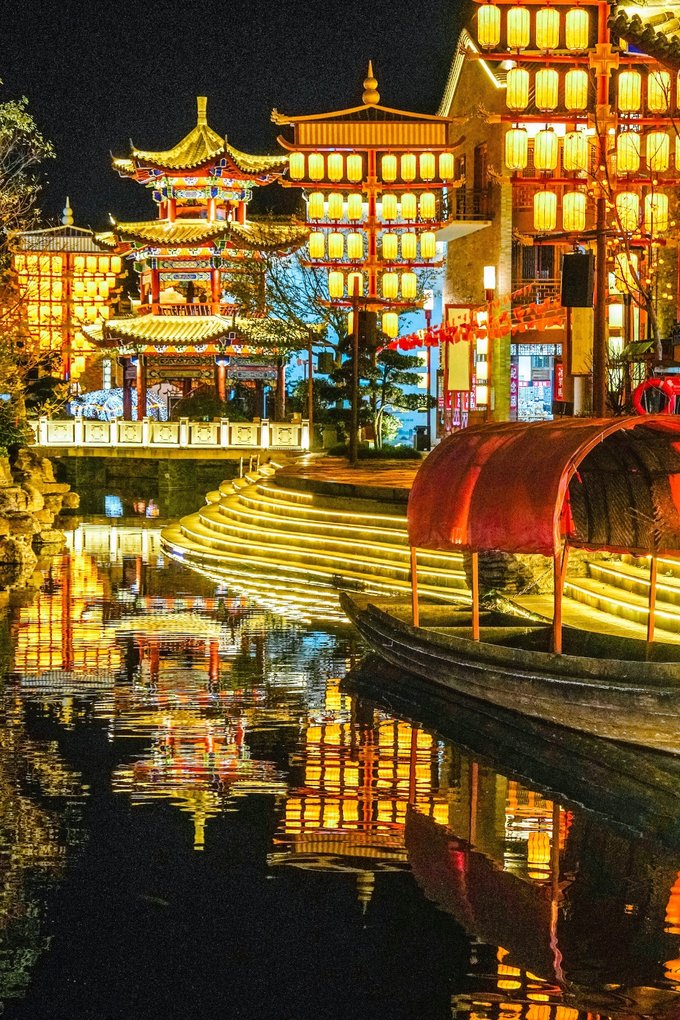 【九江梦幻古镇,误以为穿越到大唐】 第一次来九江,没想到这里居然有那么多小众又好玩的地方。柘林古镇,一个充满古色古香的地方,到了夜晚,这里灯火璀璨华丽十足。