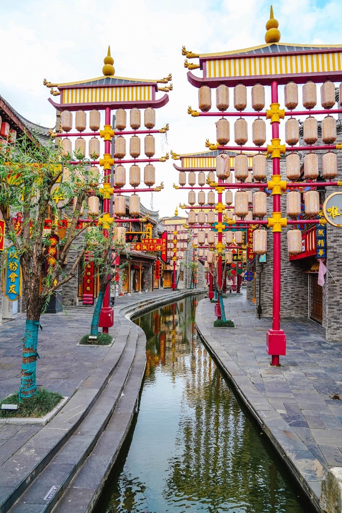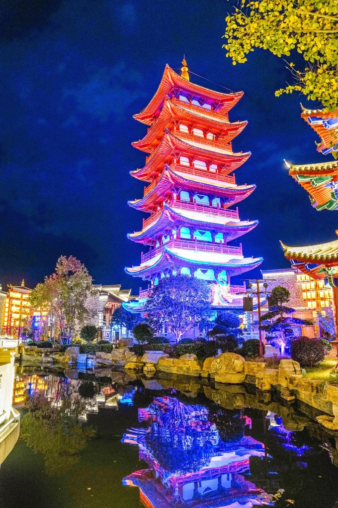 沿着河道漫步,也有缈缈柳树,它是国家重要的文化名镇,金峰塔作为小镇的中心是主要的地标之一 远远就能看到夜色亮灯的宝塔闪烁着五彩灯光。
