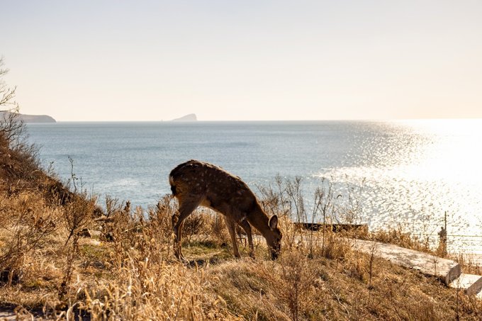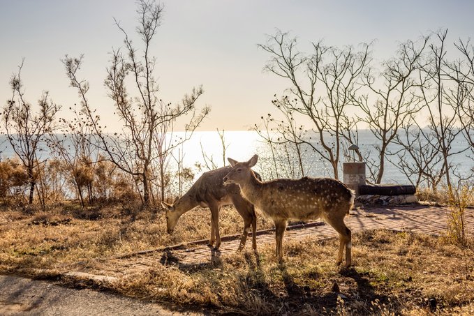 大连的野生梅花鹿放养着,而市民对此并不会感到大惊小怪,已经习惯了它们的存在。最初是莲花山,后来是付家庄、滨海路沿线、一方城堡下面……我在银沙滩遇见的它们。人与自然和谐相处,大连的这种氛围真的很好很好。大连的海边环境为梅花鹿提供了良好的栖息和繁衍条件,人们尊重和保护它们,也创造了舒适的环境,记得小鹿虽然不怕人,但最好不要投喂保持距离