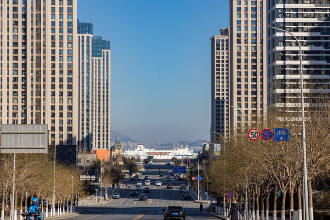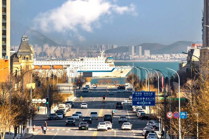 大连港东五街街道具有坡度,尽头直通大海,每日10时50分左右,会有一两艘巨大商船或客轮驶过,与干净整洁的街道、晴朗湛蓝的天空、拔地而起的高楼一起构成一幅唯美画卷 。游轮经过时间:上午 10:50左右位于大连市中山区东港商务区,全长1.5公里