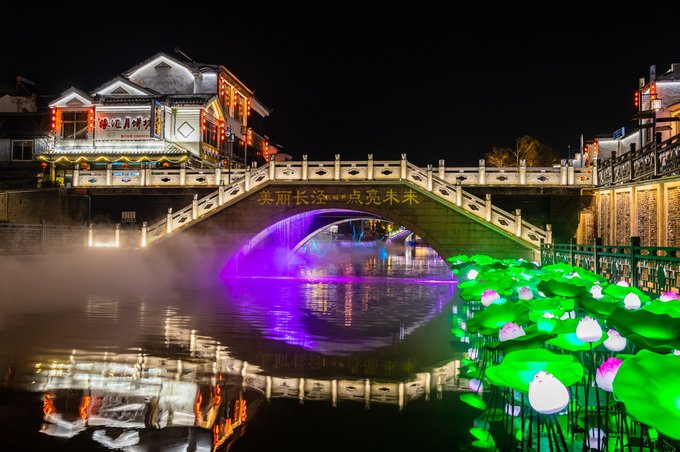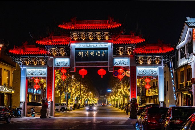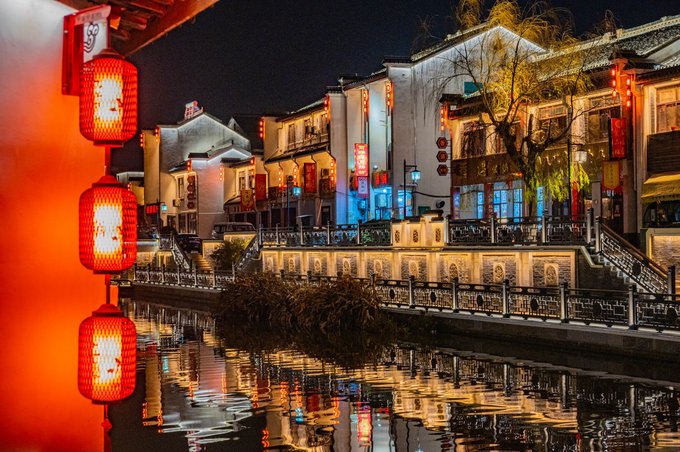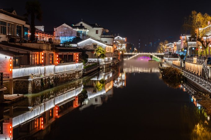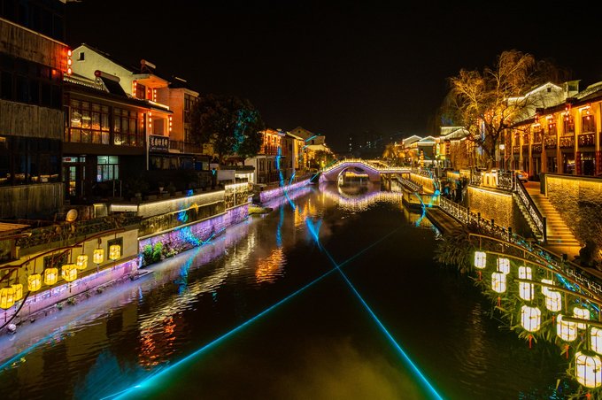 长泾老街的夜晚也是不可错过的,夜幕降临时这里有水舞灯光秀,梦里的江南水乡就这么被我们给找到了!水舞灯光秀不光是静态的灯光亮起这么简单,而是有布景、有动态的灯光演绎,也使得老街的晚上和白天是截然不同的两种感觉。