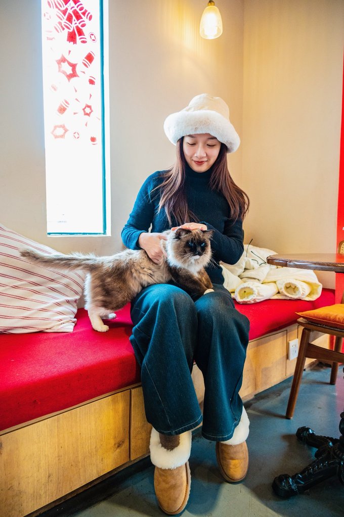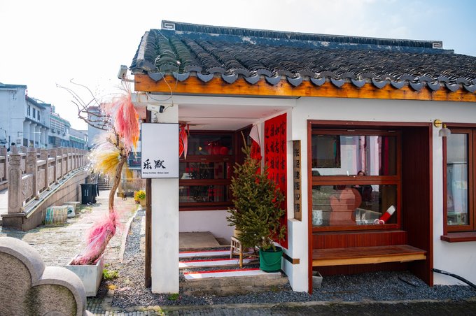 石板街长约千米,明清时期是江南地区著名的商业文化中心,现在来可以找到小茶馆或者咖啡店小坐。长泾镇为中国粗纺呢绒名镇,街上的呢大衣也可以挑一挑。另外就是逛逛纪念馆,品尝美食,感受当地生活。 我们在老街东头的乐默咖啡里待了许久,这里空间很大,环境布置氛围调性很好,春节期间也置办了很多新年元素,并且喝到了一款叫做“糖福禄”的创意饮品,是拿铁加上几颗糖葫芦。重要的是,这里还有一只可爱的猫咪,喝咖啡可以顺带撸猫,这个营销是真的戳到了我们。