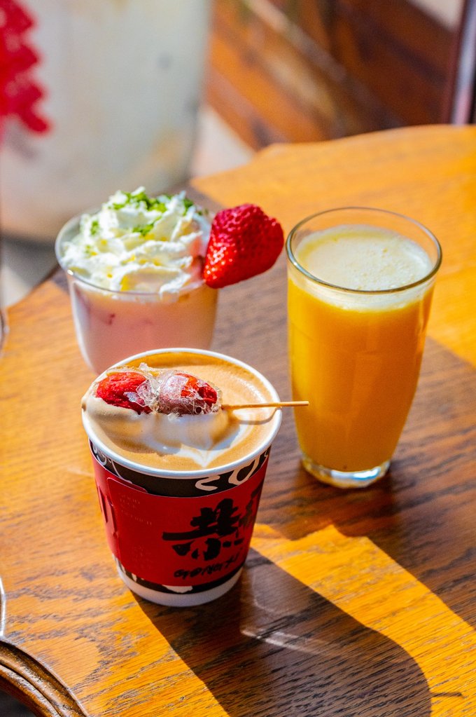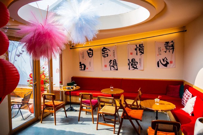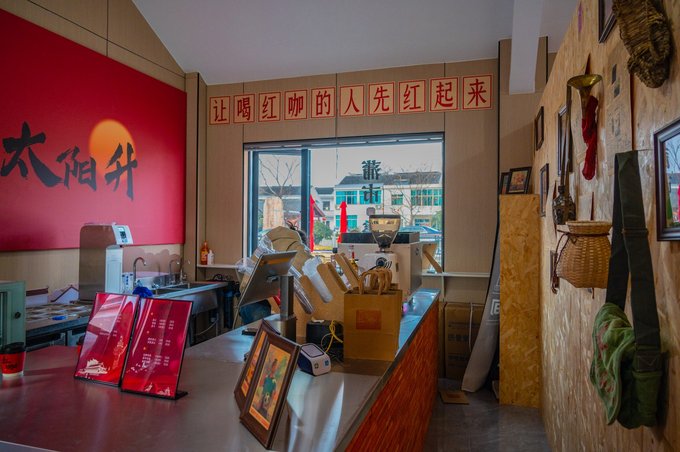 蒲市村同样也有咖啡店,叫做红咖,它是一家主打怀旧风的网红咖啡店,并且和当地的红色文化很契合。在红咖里美式、拿铁都能点到,里面还陈列了粮票、铁皮青蛙等70、80后小时候的回忆,年代感十足。咖啡店的门口还设有桌椅可以坐着晒太阳,和村民聊天。