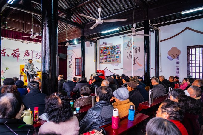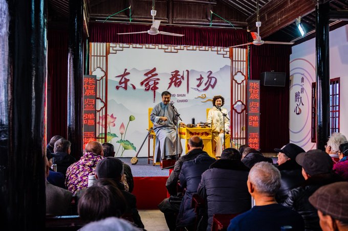 老街这边还有一座东舜剧场,是当地居民休闲娱乐的场所。春节期间这座剧场里邀请了苏州评弹团的老师来演出,演出时间是每天的12:45。如果想来听评弹是不收费的,但可能要提前来抢位置哟!镇上的大爷大妈都非常积极爱听。