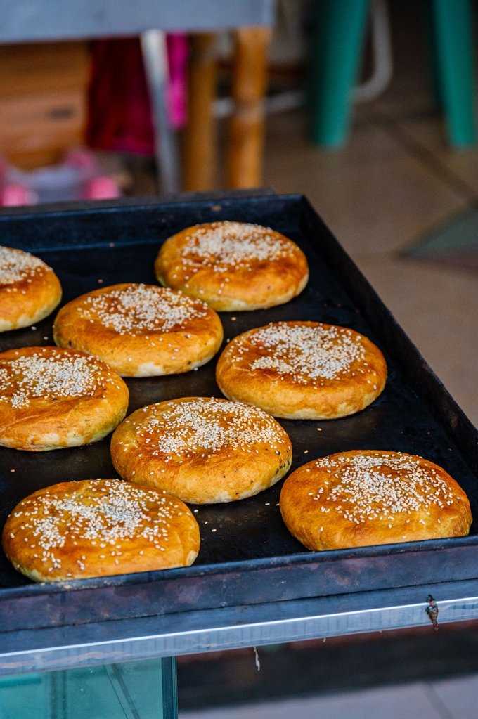 来到长泾镇,不得不提的是长泾烧饼和长泾月饼。月饼现在不是季节,那就尝了尝长泾烧饼。据说长泾烧饼的历史可以追溯到清朝,至今已有三百年。其制作工艺独特,外壳由面粉发酵后包以油酥,用擀面杖卷出层次,馅料通常是一半荠菜一半豆沙,表面撒上芝麻,放入烤箱烤制。也被列入了江阴的非物质文化遗产。
