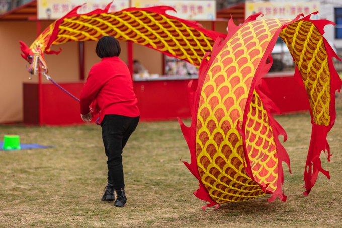 在今年春节期间,村里有很多过年活动轮番上演,真的相当热闹。你看,在村口草坪上,龙身金光流转,寄托着人们吉祥如意,幸 福安 康的美好心愿。