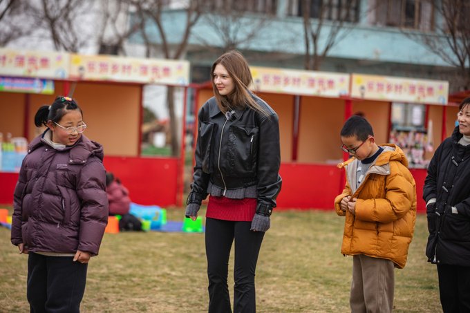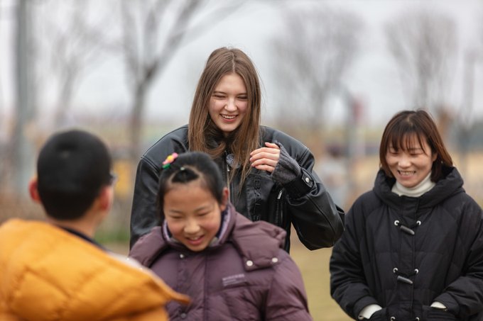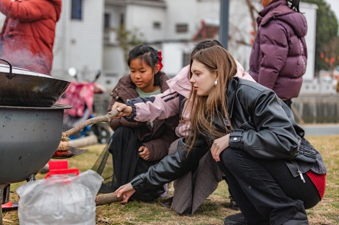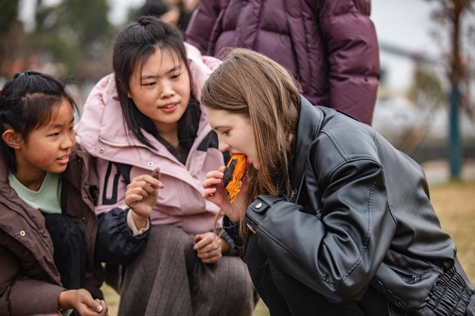 我们同行的小伙伴是个外国小姐姐,孩子们将她围住,一定要让她也品尝一下煮熟的红薯。小姐姐开心地吃了起来。