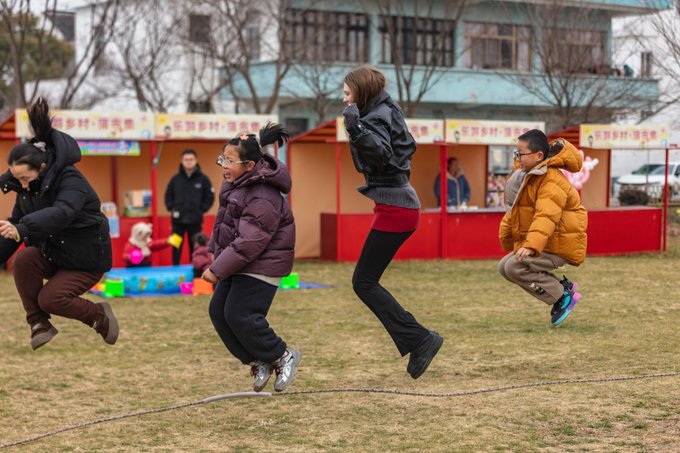 孩子们一起在玩跳绳比赛。他们几个人为一组,需要齐心协力才能在规定的时间内赢得比赛。赢的那组还会有小礼物哦!
