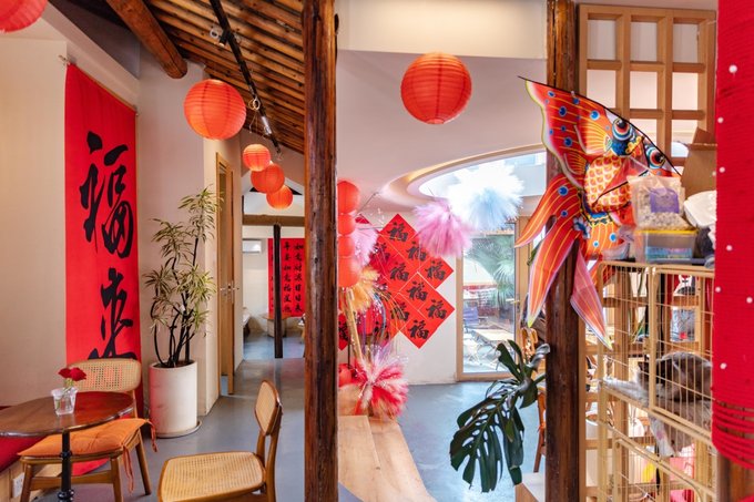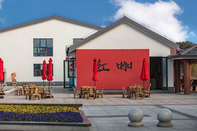 谁能想到,红色文化与咖啡竟能碰撞出火花?红咖选址在蒲市村花田旁,周边是大片的粉黛乱子草,据说每到花季,粉红色的花海如梦似幻,是一道亮丽的风景线。