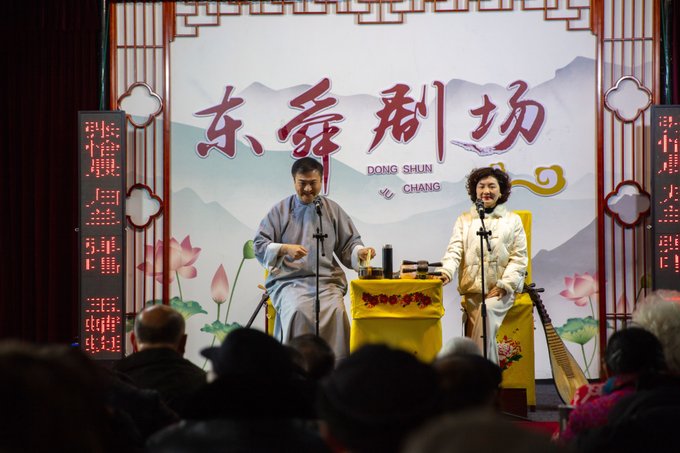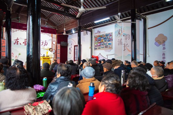 在古镇的东舜剧场可以欣赏到传统的评弹表演。坐在古色古香的戏台下,听着婉转的唱腔,仿佛穿越回了那个悠然自得的年代。