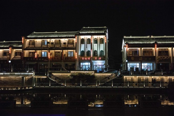 沿着河岸漫步,还能看到几艘小船停靠在岸边,街巷的房子内有灯光透过窗户洒出来,暖暖的,给人一种家的温馨。
