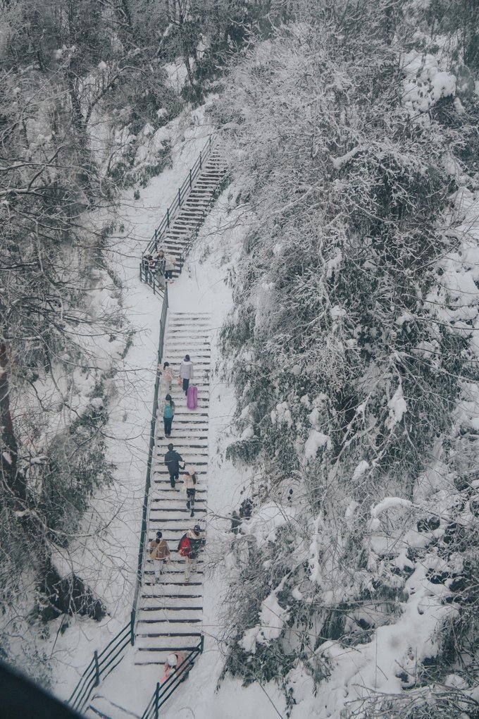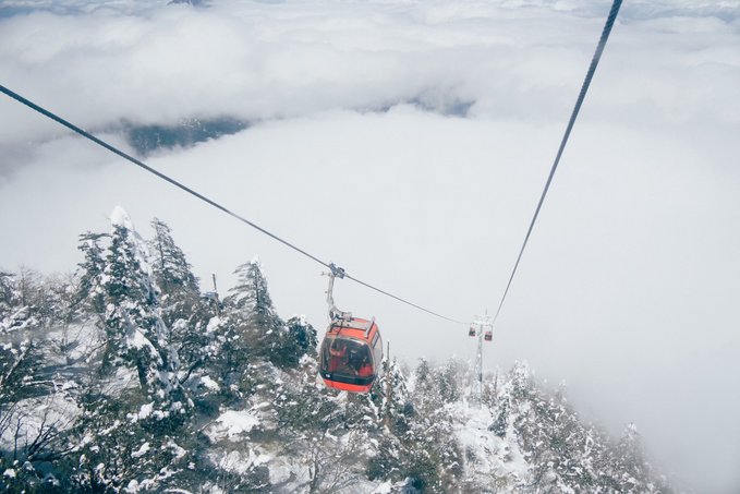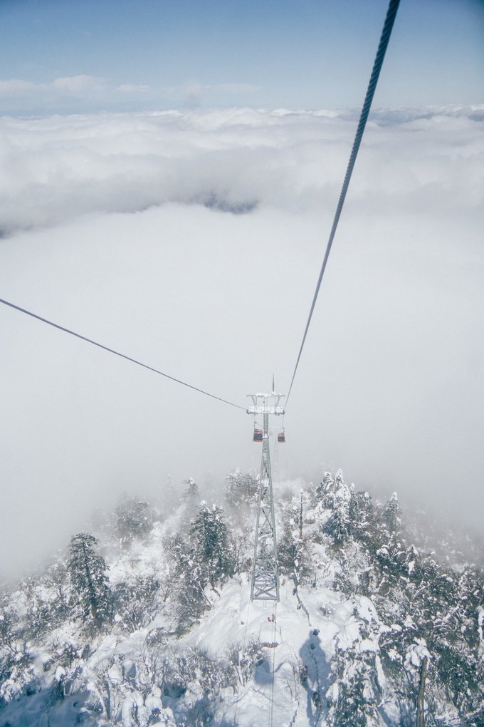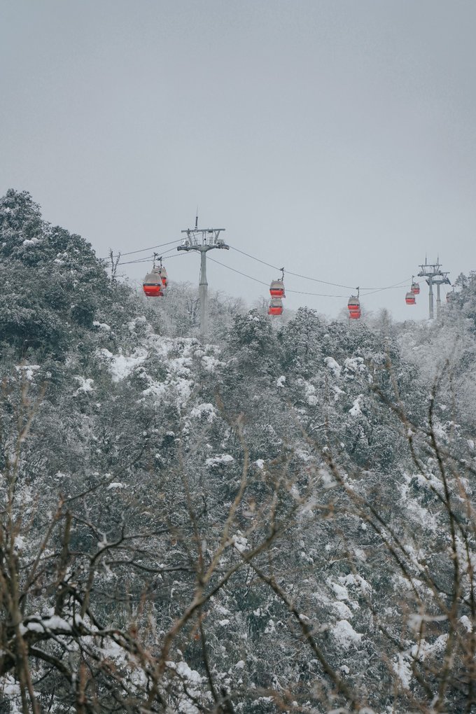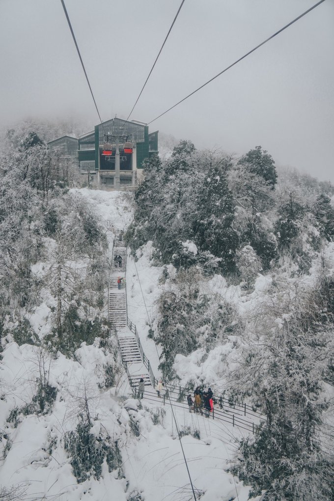 乘坐索道还未到山顶,半山腰已经是白雪皑皑: