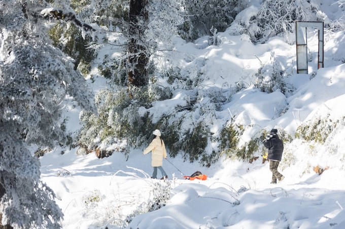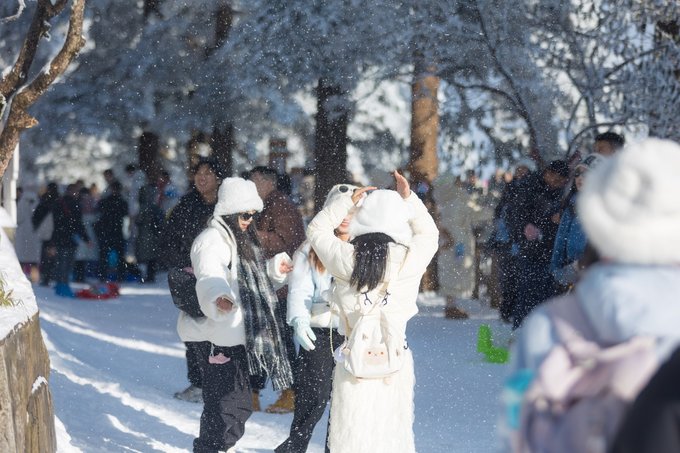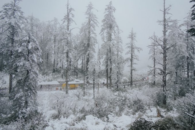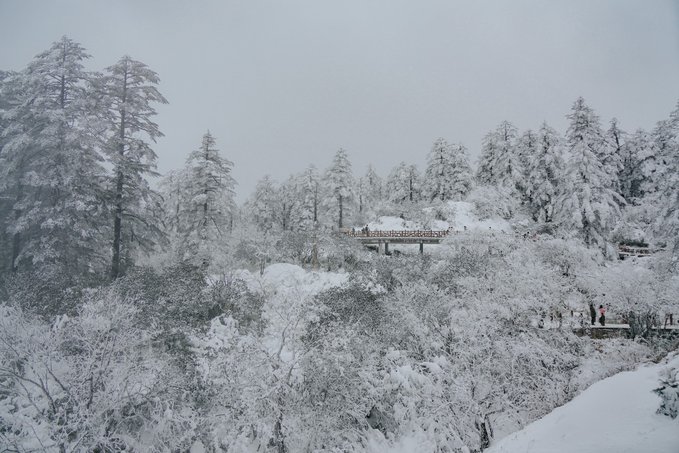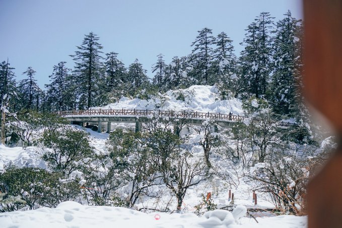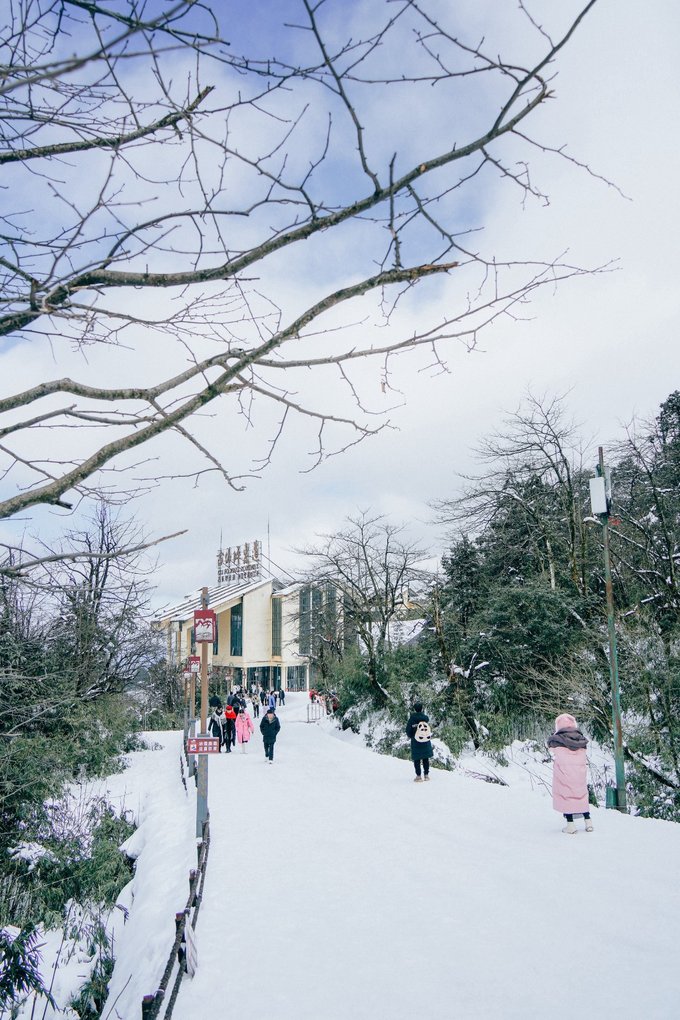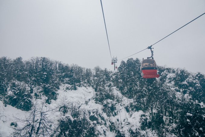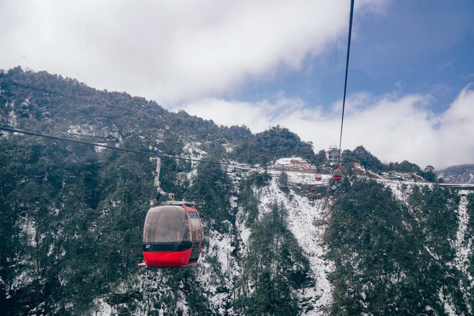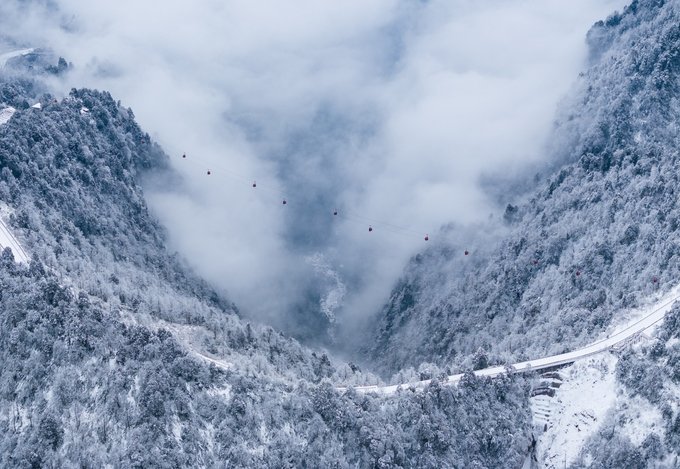 乘坐索道还未到山顶,半山腰已经是白雪皑皑: